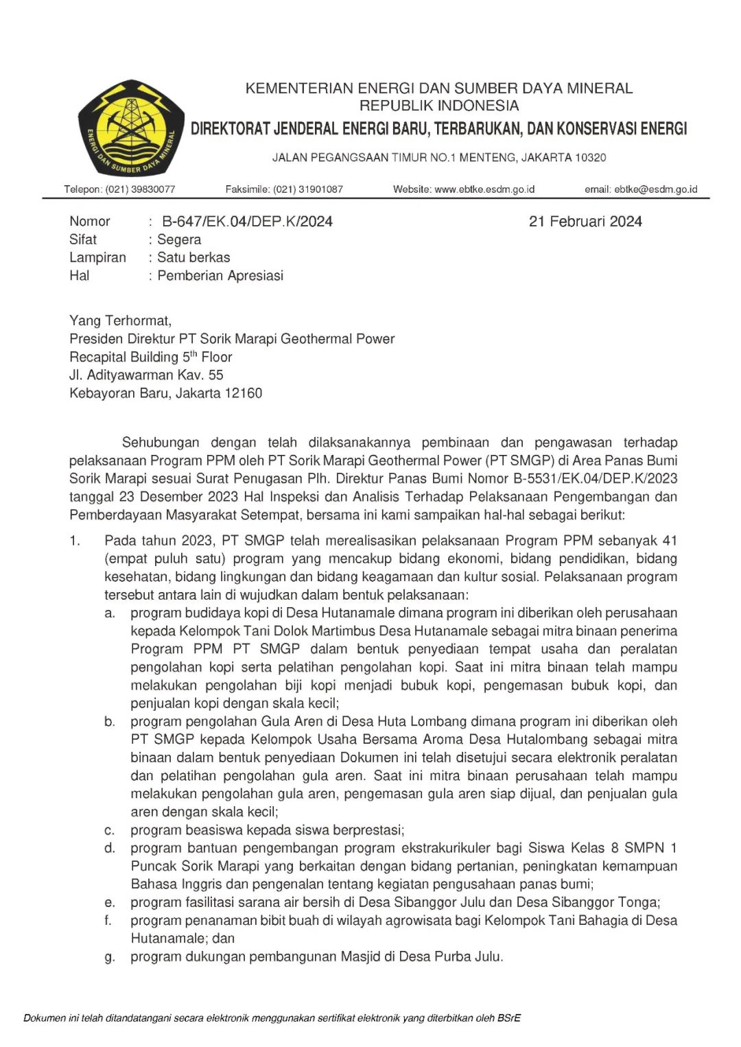 今天上午,開山集團投資在蘇門答臘Mandailing Natal縣的地?zé)犴椖抗綪T SMGP收到一份來自印尼能礦部可再生和新能源總局(EBTKE)地?zé)崽庨LPak Harris簽署的“致PT SMGP的感謝信”,該信函的主旨是對SMGP公司 CDCR 團隊為 Sorik Marapi-Roburan 工作區(qū)的社區(qū)發(fā)展計劃所做的巨大努力表示感謝。SMGP實施的社區(qū)發(fā)展計劃和援助表明,除了為SMGP運營所在地的社區(qū)持續(xù)提供地?zé)衢_發(fā)所產(chǎn)生的電能外,公司還致力于提供其他福利。