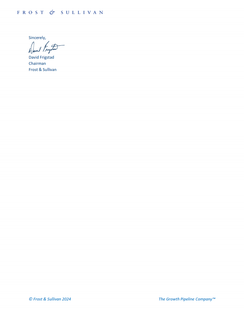 Frost & Sullivan主席通知開山獲獎的祝賀信